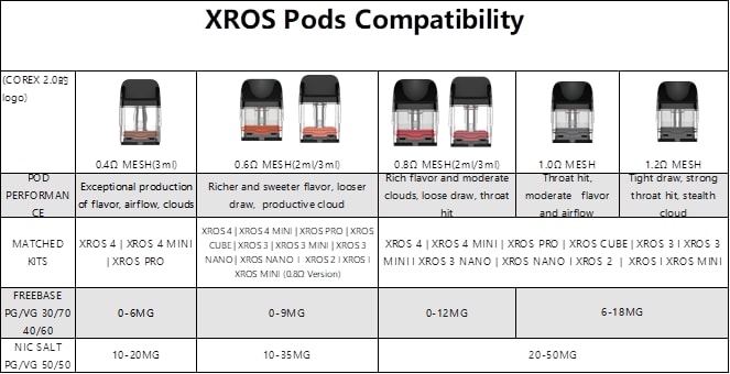 Parfaites pour vaper des e-liquides à haut taux de nicotine ou des e-liquides aux sels de nicotine, les résistances intégrées aux cartouches Xros se déclinent en deux modèles Mesh et une version Corex 3.0: